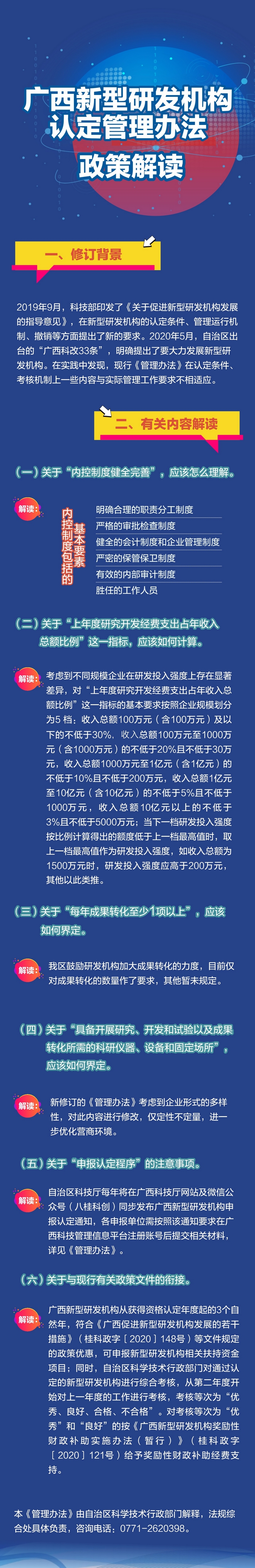 本《管理办法》由自治区科学技术行政部门解释,法规综合处具体负责,咨询电话:0771-2620398。